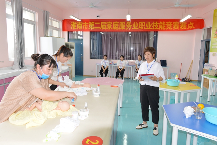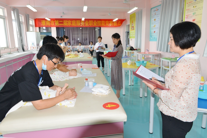 本次竞赛,由理论知识竞赛和操作技能竞赛组成,通过理论笔试、婴儿洗浴、婴儿律动操、婴儿果汁制作等竞赛环节,展示淮南市家政服务队伍的风采。笔试考场,选手们冷静思考、认真作答;实操赛场,选手们一边娴熟操作,一边解说要点。评委们公平公正,现场打分。