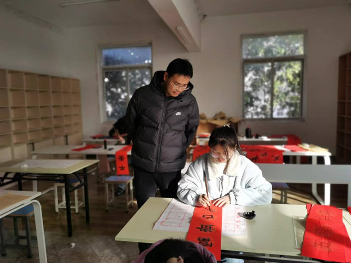 活动中,丁杰来到社团,看到书法社成员所写的春联后很高兴,赞扬了岳淼淼等社团成员们写下的春联,他也对此饶有兴致,并亲自书写了一副春联,字里行间充满了对师生的深情问候、温馨祝福及对社团的支持和鼓励。