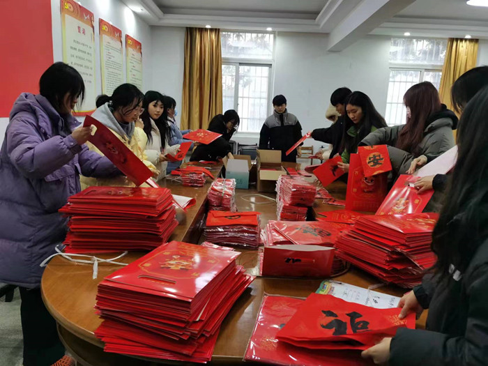 为迎接龙年春节的到来,弘扬中华优秀传统文化,向学校师生传递美好的祝福,营造喜庆祥和的节日氛围。1月9日,在学校党委的高度重视和关心下,由学生处(团委)牵头,在教学楼党员活动室组织开展了“迎新年、写春联、送五福”送春联活动。