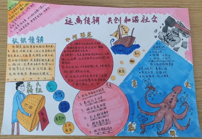 活动通过全校排查、主题班会、主题手抄报、电子屏、广播宣传等方式进行。通过反传销系列活动,让学生了解到什么是传销、传销的主要表现形式、传销如何对新人“洗脑”、如何有效地保护自己等多个方面内容。大力宣传《禁止传销条例》和国家有关打击传销的法律、法规,引导学生充分认识传销的欺诈性、隐蔽性和危害性,帮助广大学生提高识别能力,增强防范意识,自觉抵制传销、远离传销。