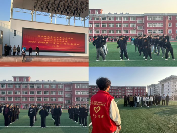 赛前,各班级已完成列队集结,身着运动服的同学们精神抖擞,在候场区域反复打磨动作细节。随着比赛的开始,运动场上瞬间奏响熟悉的旋律。赛场上,高职班级完成第九套广播体操展示,中职班级依次展示第九套广播体操与韵律操《我们都是追梦人》。广播操环节同学们抬手、踢腿、弯腰、伸展,每一个动作都力求规范标准,队列转换整齐划一,充分展现了日常训练的扎实功底;韵律操环节则更显灵动活力,同学们伴着明快节奏跳跃转身,动作衔接流畅自然,笑容里洋溢着少年的朝气与活力。