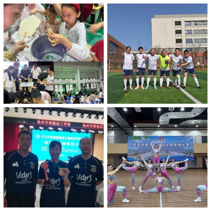 体育赛事捷报频传。校内篮球交流赛、师生乒乓球比赛、足球比赛等赛事轮番上演,既增进了师生情谊,又锤炼了身体素质。对外参赛更是硕果累累:在安徽省第九届技工院校运动会上,我校教职工顽强拼搏,斩获多项佳绩,展现了过硬的身体素质和竞技水平;在安徽省人社系统暨技工院校羽毛球比赛淮南赛区选拔赛中,我校教师汪学品勇夺冠军;2025年,校足球队斩获淮南市五人制足球赛三等奖;同年10月,我校教师刘军代表淮南市出战省“足协杯”中老年足球赛,勇夺季军,为学校和淮南市赢得了荣誉;同年11月,在淮南市第十届运动会上,我校代表团大放异彩,教师健美操队荣获第二名的好成绩。
