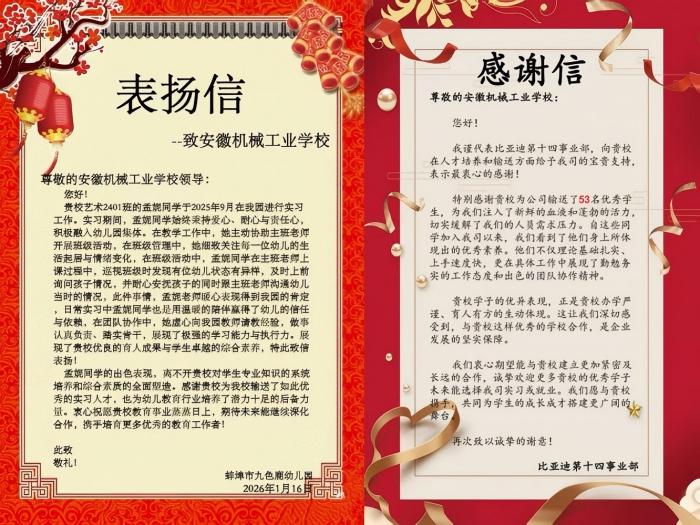 我校24级中职生参加工学结合以来,学校先后收到合肥比亚迪股份有限公司、蚌埠市九色鹿幼儿园的感谢信。他们对我校学生在岗展现的扎实专业素养、积极工作态度和较强实践能力给予高度评价,字里行间满含对学校人才培养质量的认可与赞誉,为我校深化产教融合、推进工学结合人才培养模式写下生动注脚。