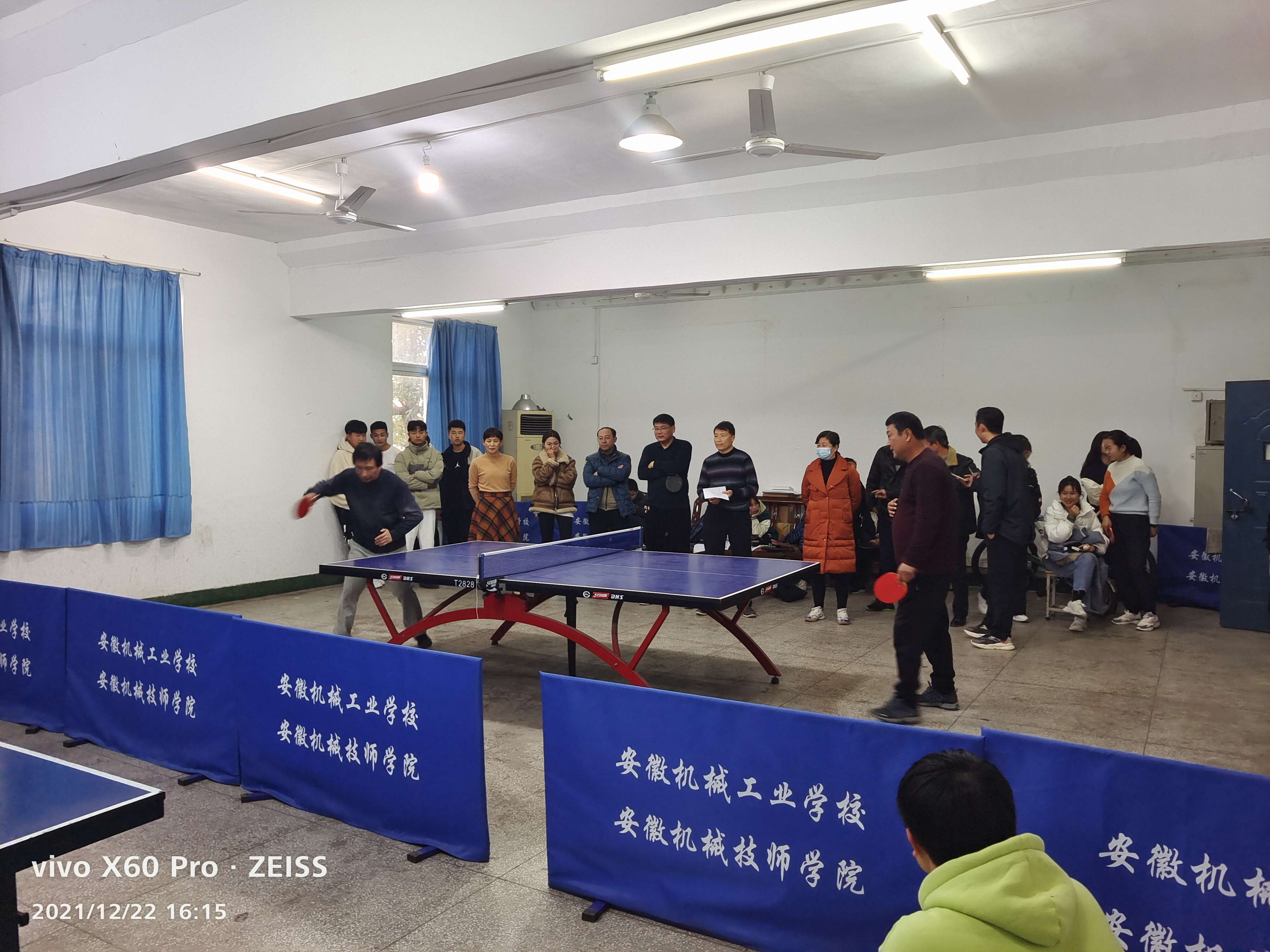 2021年12月22日下午,我校2021年度师生乒乓球团体赛在教学楼二楼乒乓球室举行。本次团体比赛以系部为单位,组建了男子代表队、女子代表队,每队9人,其中男队中教工4人,学生5人;女队中教工3人,学生6人,四个系部共组织8支代表队70多名乒乓爱好者参加了这项比赛。