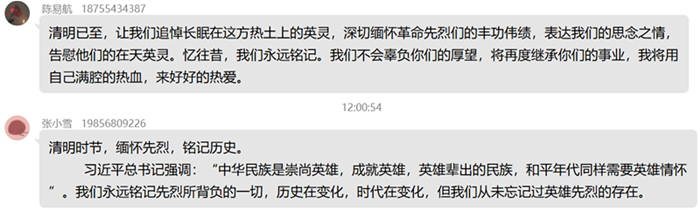 在这次活动中,大家了解了“清明节”的由来、习俗以及英烈们的英勇事迹,体会到今天幸福生活的来之不易。同学们在班级QQ群里表达了对革命先烈的崇敬和感恩之情,他们有的表达感谢、有的表明志向,但无不流露出对英烈的敬仰和立志报国的决心。