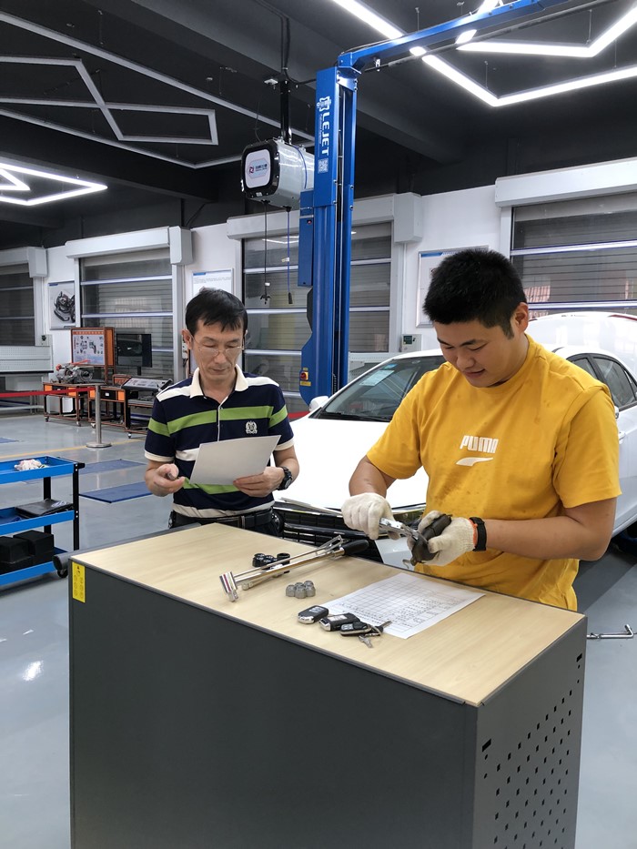 比赛围绕汽车制动系统,涵盖轮胎的拆装、制动系统的检测和测量等,采取评委与选手一对一模式,从速度、质量和操作规范等方面全程、全面考察。比赛现场氛围浓烈,选手们戴上手套,有条不紊、严格规范地作业,看似平静的气氛下,实则都在暗暗较劲,大家充分发挥了自己的实践操作能力,最终三名青年教师脱颖而出。
