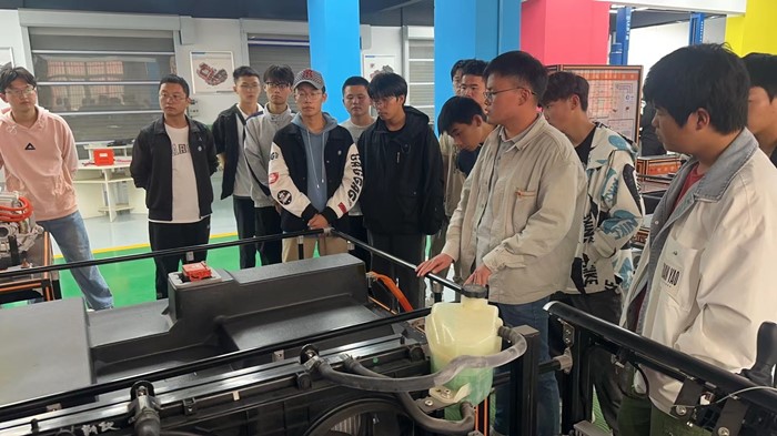 接着,在三位老师的带领下,大家参观了新能源汽车专业学习工作站。蔡凡昌老师对照实车讲解了混合动力汽车和纯电动汽车的区别,介绍了相关零部件,演示了汽车维修工具的使用方法,使大家对汽车有了更深的认知。