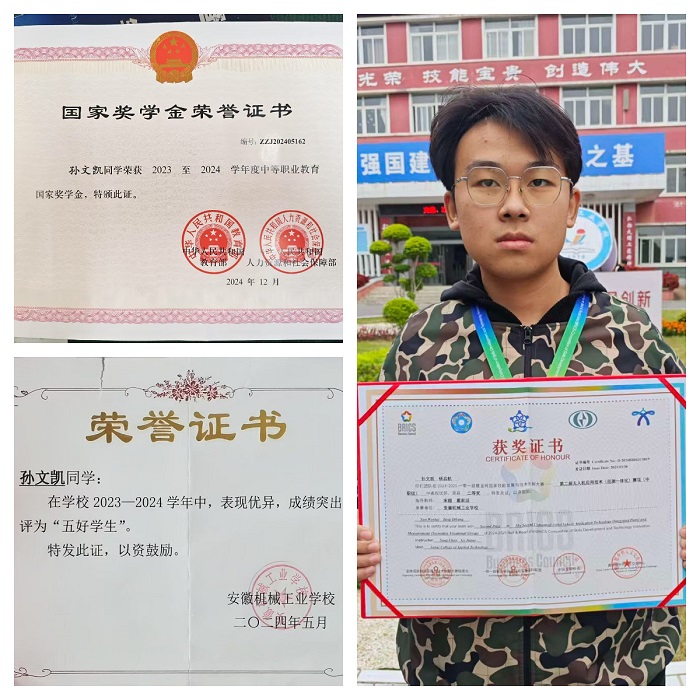 除了学业上的优异,孙文凯在专业技能领域同样大放异彩。2024年,他凭借过硬的技术功底,在“一带一路”金砖国家无人机巡测一体化赛项中脱颖而出,斩获国家二等奖,将中职学生的专业素养展现于国际交流舞台。此外,他还多次获评校级“五好学生”“优秀班干部”,每一份荣誉都凝聚着他的汗水与坚持。