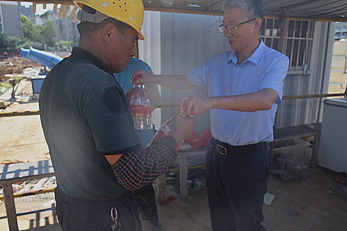 近日,随着夏季高温的持续,党委书记、校长徐黎心系一线施工人员,前往学校运动场建设现场开展慰问,为在高温下坚持工作的工人们送去了清凉与关怀,党委委员,副校长丁杰、总务处相关人员陪同前往。